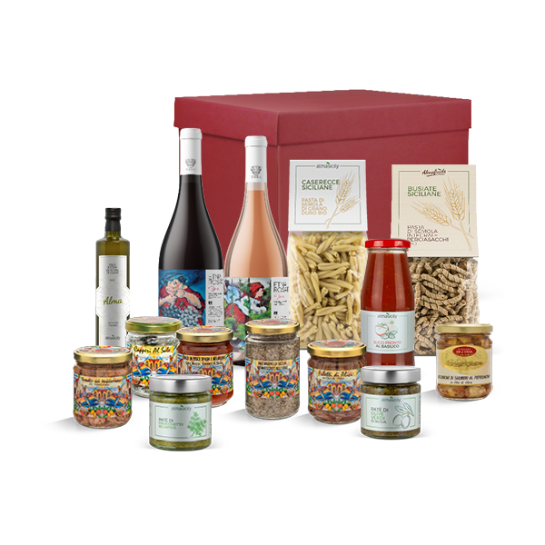 Un cesto ricco di prodotti siciliani tipici, alcuni tra le migliori conserve di tonnara siciliane. Potrete realizzare un ricchissimo antipasto, per passare poi ai primi, con le nostre paste ed i sughi pronti, realizzati come da tradizione. Il tutto, accompagnato da due dei vini etnei più apprezzati del momento, realizzati con uve dei versanti più unici e fertili del vulcano Etna. Pensato per chi ama i sapori autentici e desidera condividerli con amici e parenti.
