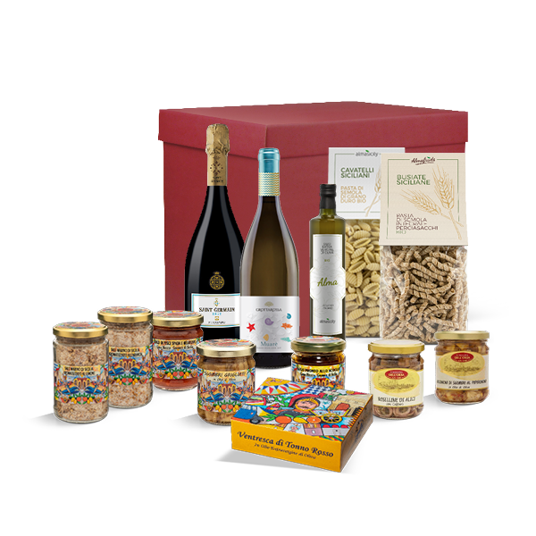 In questo cesto natalizio Almasicily ha selezionato i prodotti tipici e le prelibatezze dolci e salate per permettervi di fare un regalo di alta qualità per accontentare anche i palati più esigenti. Un Natale pieno di gusto e qualità grazie alla paste di grani antichi siciliani, i sughi pronti, l’olio extra vergine d’oliva, i patè, la frutta secca, le marmellate e i dolcetti tipici Almasicily che in questo cesto si incontrano con il panettone tradizionale, il buon vino siciliano, il formaggio ed i salumi artigianali. Inoltre in questa cesta regalo trovale le novità assolute come la crema dolce alle mandorle e al pistacchio.