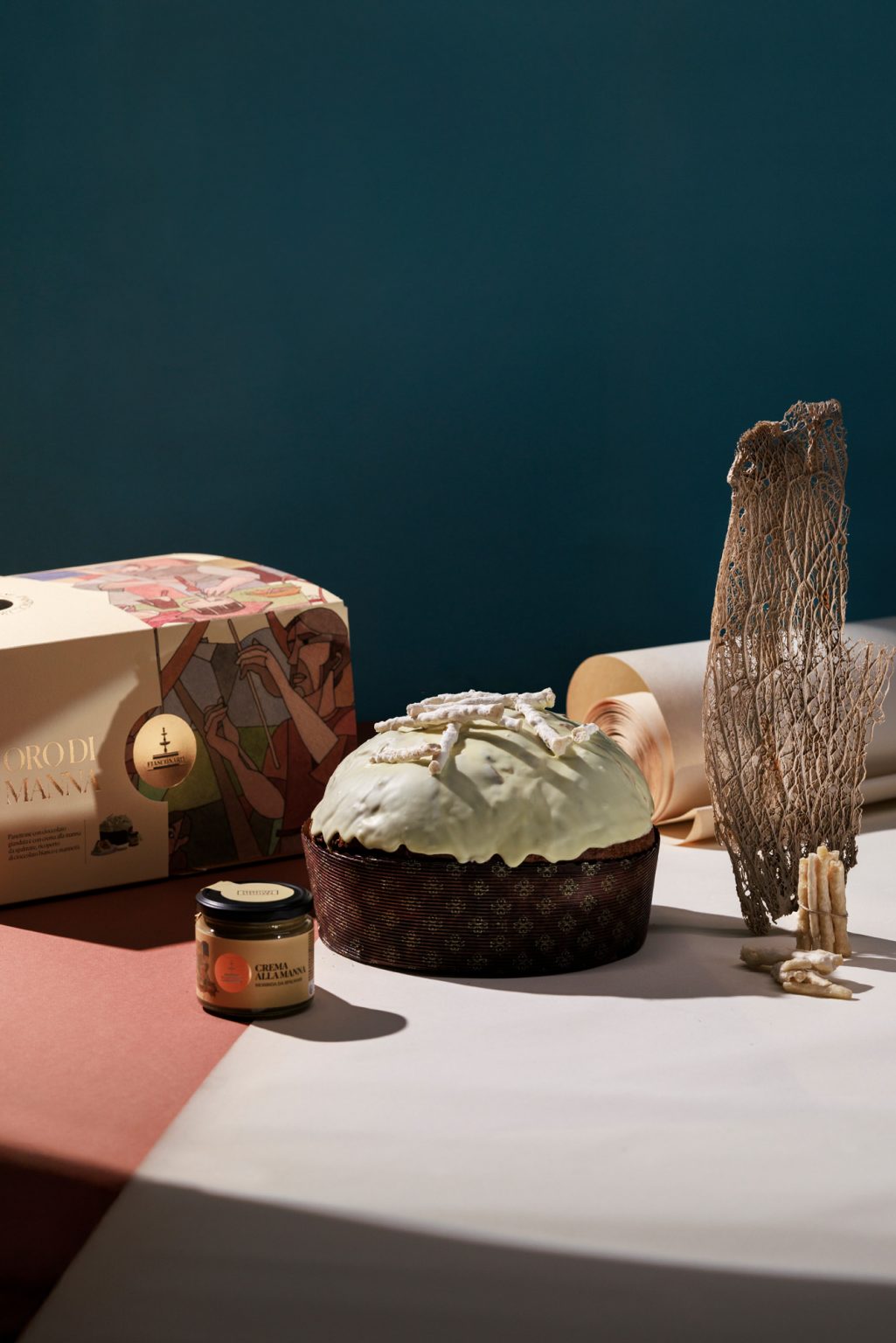 Ingredienti Panettone: farina di grano tenero, burro, zucchero, uova, tuorlo d’uovo, lievito naturale, pasta alla manna, miele di Sicilia, purea di arancia, burro di cacao, manna, latte scremato in polvere, sale, aromi naturali (bacche di vaniglia), gocce di cioccolato gianduia, glassa bianca con mannetti.