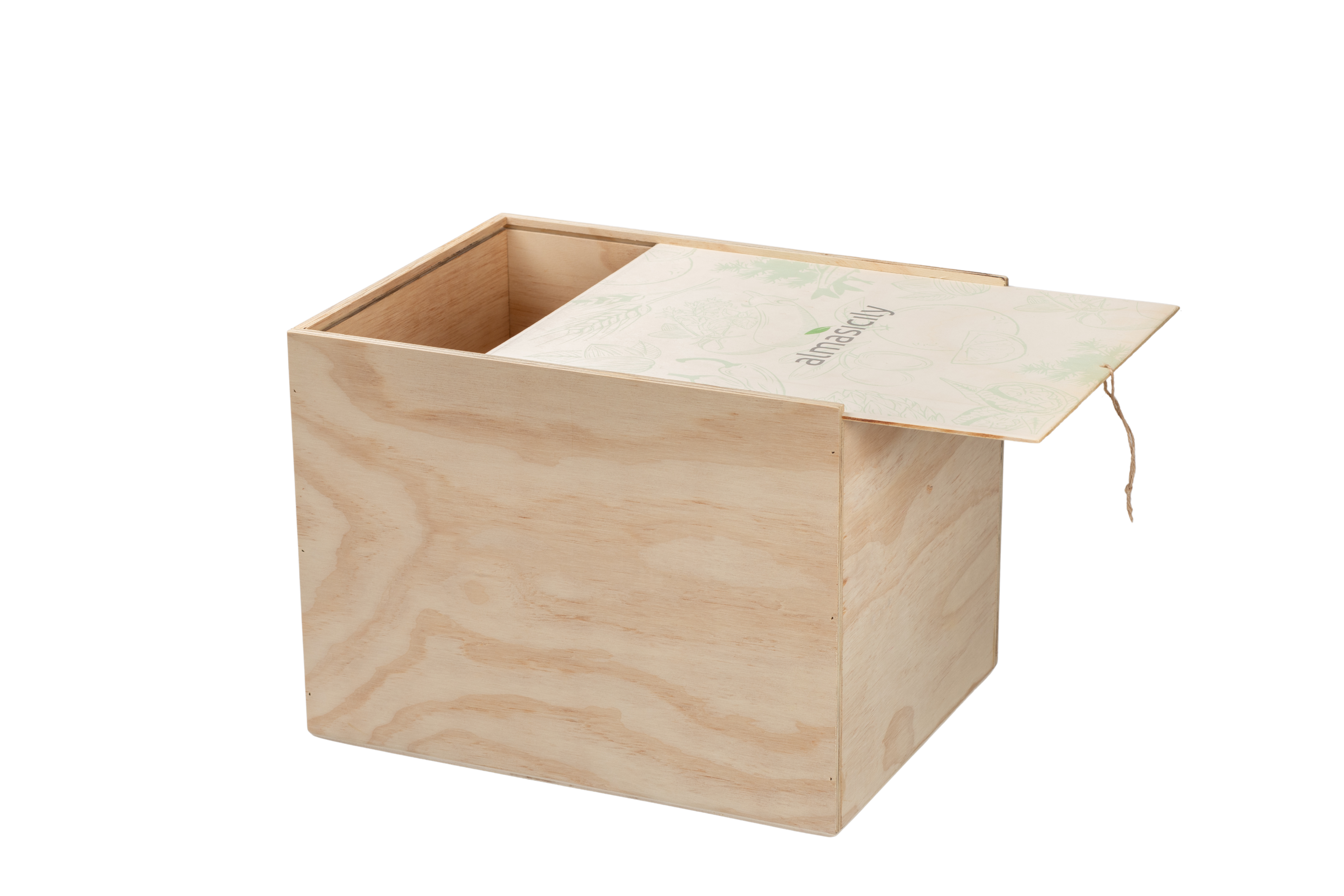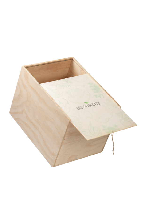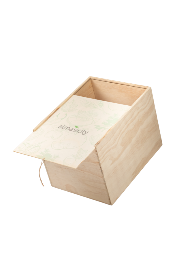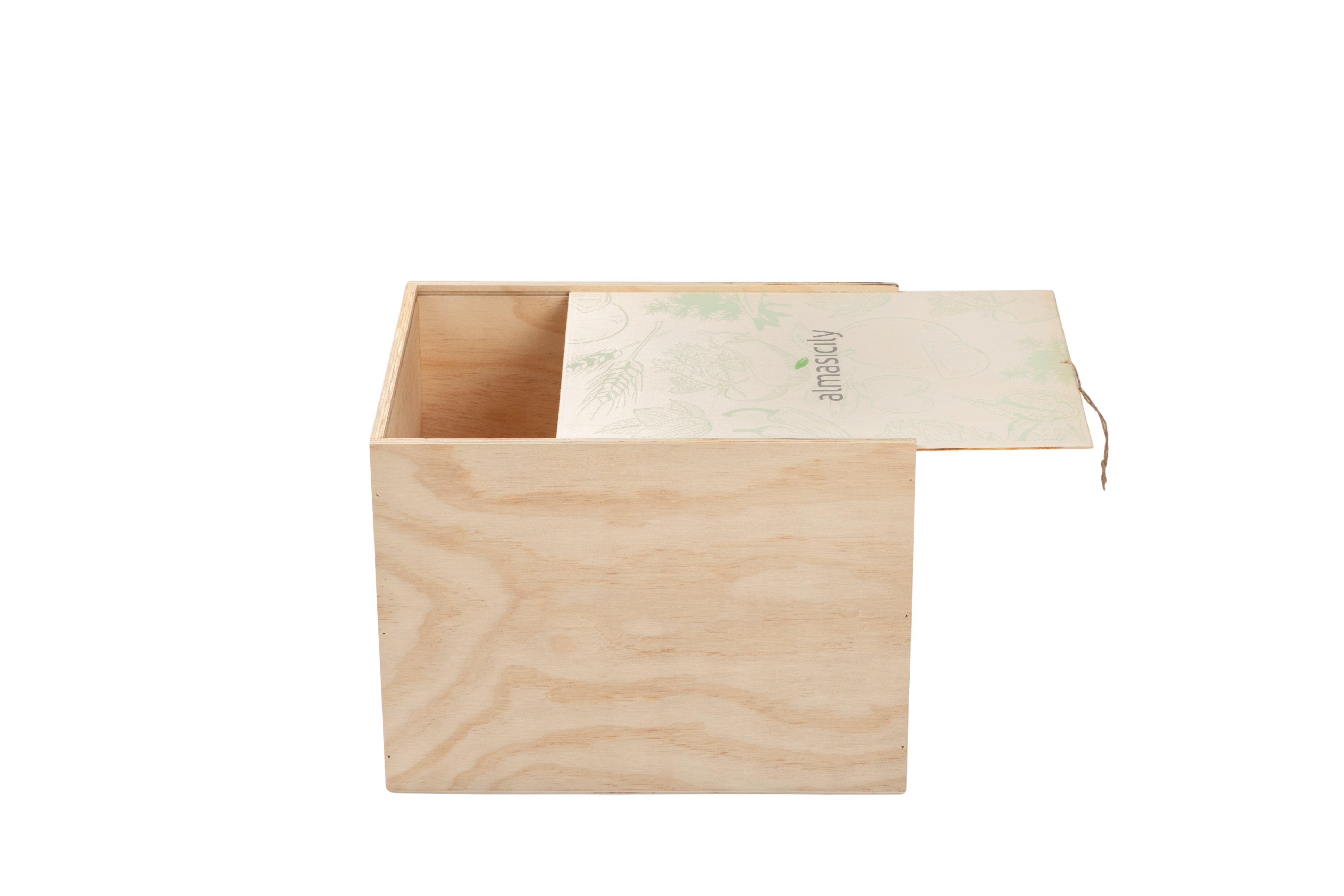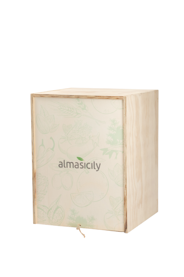Questa elegante scatola in legno è il modo perfetto per regalare o ricevere i prodotti AlmaSIcily. Il suo design semplice e lineare la rende perfetta per qualsiasi occasione.