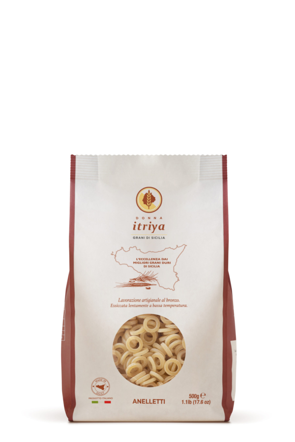 Gli Anelletti Siciliani Donna Itriya rappresentano uno dei formati più amati e identitari della tradizione gastronomica dell’isola. Realizzati esclusivamente con semola di grano duro siciliano accuratamente selezionata, vengono lavorati con trafile al bronzo per garantire una superficie ruvida e porosa, ideale per trattenere al meglio i condimenti.