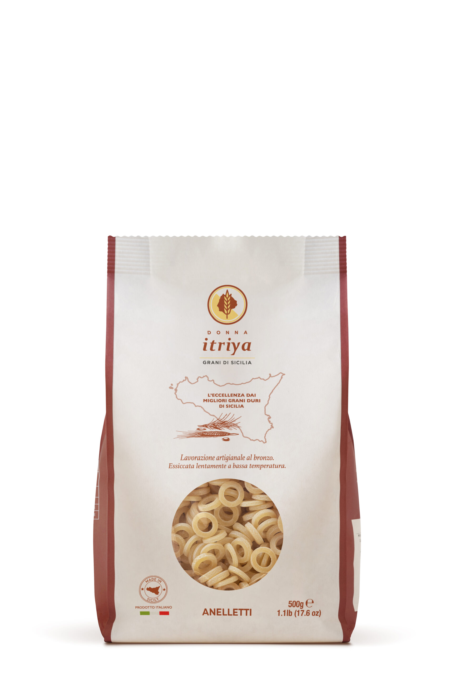 L’essiccazione lenta a bassa temperatura mantiene intatte le qualità nutrizionali ed esalta il colore giallo paglierino e l’aroma naturale delle semole siciliane. Con una struttura tenace e una cottura perfetta al dente, gli anelletti Donna Itriya sono protagonisti di ricette iconiche come la pasta al forno alla siciliana, ma si prestano anche a interpretazioni creative e moderne.